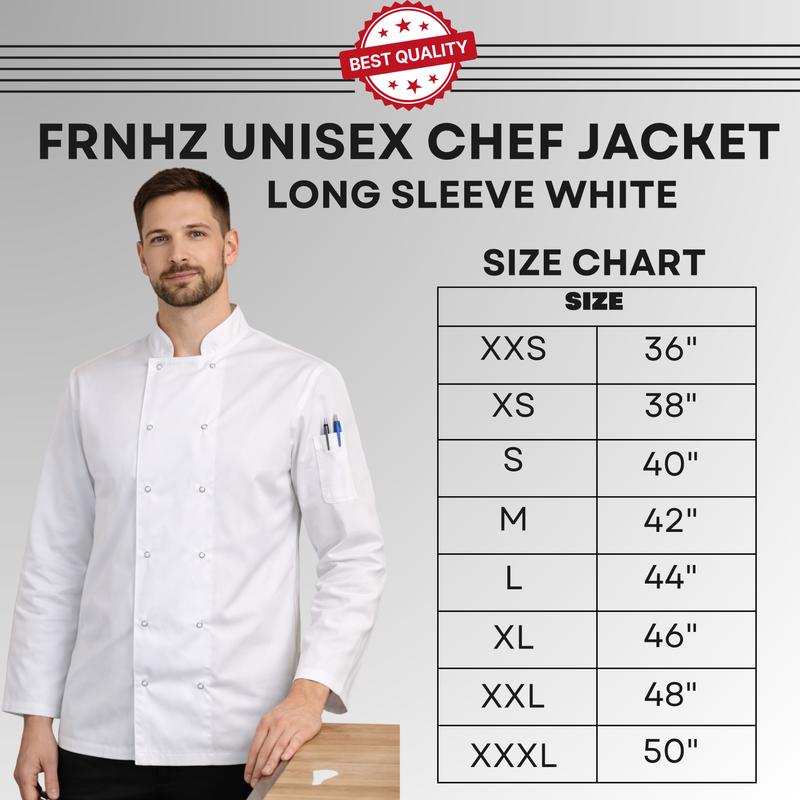 Upgrade your kitchen uniform with this professional chef jacket, designed for comfort, durability, and performance in fast-paced environments. Ideal for chefs, cooks, and catering staff, this unisex long sleeve chef coat delivers a clean, modern look while providing essential protection during service.